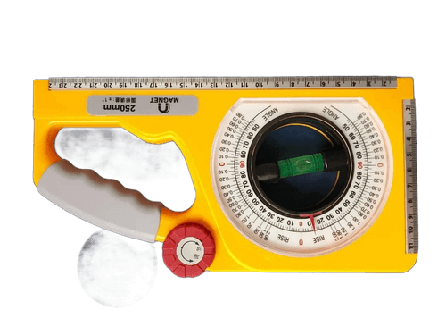 This mechanical inclinometer angle slope meter is a precision tool designed for measuring angles, slopes, rise, and fall in construction, engineering, and installation work. It features a clearly marked circular angle scale combined with a built-in bubble level for reliable, non-electronic measurement. The robust plastic body includes a comfortable handle for easy positioning and handling on site.